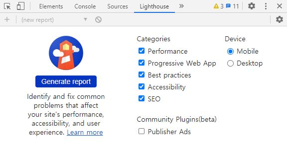 크롬에서 f12를 누른 후 lighthouse탭으로 이동하여 generate report를 클릭한다