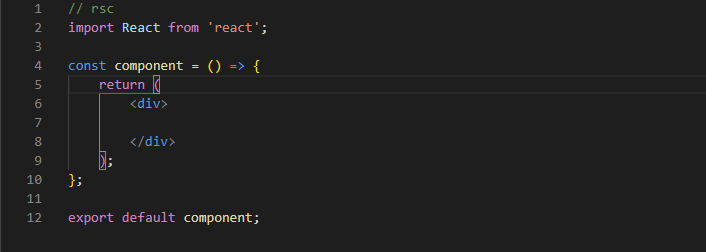 react를 사용할 때 컴포넌트 등을 쉽게 만들 수 있는 스니펫입니다. 저는 주로 rsc 단축어를 많이 사용합니다