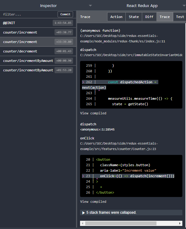 이 외에도 DevTools에는 디버그 하는데 도움이 되는 몇 가지 추가 명령과 옵션이 있습니다. 오른쪽 상단의 'Trace'탭을 클릭해 보세요. action이 store에 도달 했을 때 어떤 코드들이 실행되었는지 스택으로 나타납니다.