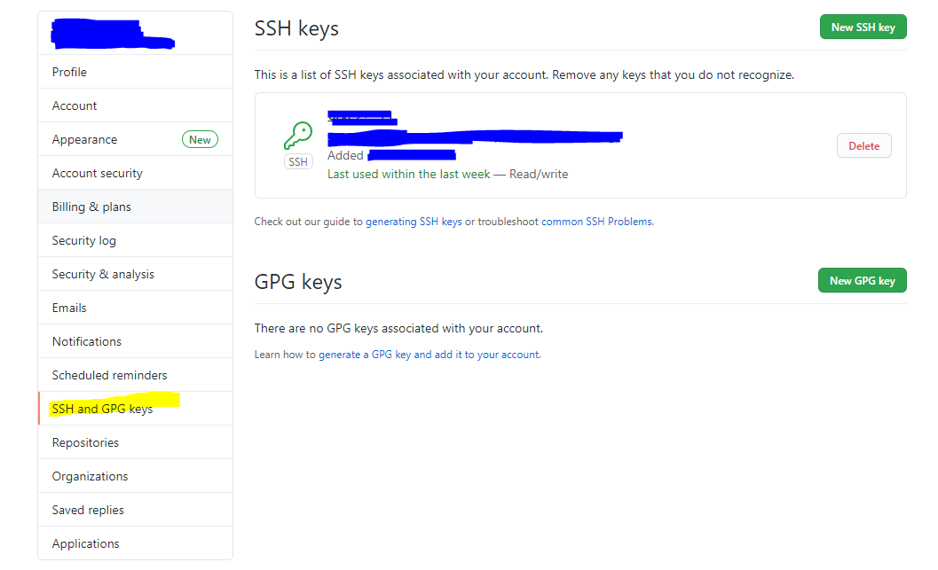 아래 탭에서 new ssh key를 눌러 ssh key를 등록합니다. title은 편하신 이름으로 설정한 후 key부분에 복사한 ssh-key를 입력하면 됩니다. 완료가 되면 아래와 같이 ssh key가 연동됩니다.